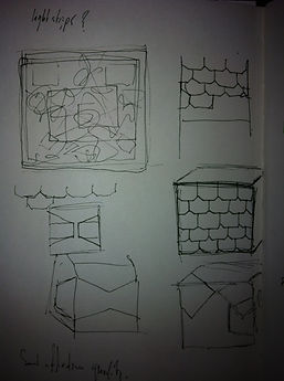 The above sketches were working out the internal AV equipment as well as trying out different ideas. There will be two projectors with 5 faces on the cube which means decisions will have to be made, they could be on opposite sides, adjacent or even projected over two sides, however this would create a very abstract image with parts being out of focus. I need to think about how I can encourage the viewer to walk around the room as opposed to standing still at the watching from the entrance, encouraging interaction with the piece, if they walk to the opposite side of the room there has to be a pay off for them to do so. I also lent consideration to what would be on the blank sides of the cube, playing ideas with having textured paper, or placing tree branches within the cube creating interesting shadows on the sides of the box. I also need to think where the speakers will sit, the internal structure, what the projectors will be sat on, without blocking light or creating shadows, as well as the placement of the LED strip lights.