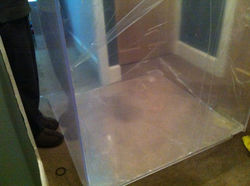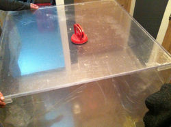 I came up with several different ideas for the construction of the cube itself, but working out the best option was a tricky development process. Initially I was thinking of a wooden structure, however I needed to think of transportation as a 1m3 box would not fit through a standard door. So I developed plans for essentially a flat pack cube, where the sides would slot together on site. Primarily I thought of stretching the paper over the open faces, however I was concerned for it's fragility. From this I concepted using clear acrylic to mount the paper on, though some consideration would have to be made as to how to mount the acrylic onto the wooden structure. Having gone into a hardware store to test materials I found that the cheaper thin acrylic was a bit too flexible at this size and made me doubt this technique. I also saw a drawback to using an internal wooden frame structure, in that It would create very strong internal shadows, obstructing the internal glow. What's more it seemed overly complicated, a simple structure would be a lot more effective, so I considered using only acrylic with thicker more rigid sheet. The only real drawback to this new idea was the cost, thick acrylic costs a lot more then the thinner stuff. However this would create a quick to put up effective structure. So I went about sourcing some acrylic, managing to find some half the price from a building project which got cancelled. 10mmx995mmx995mm.