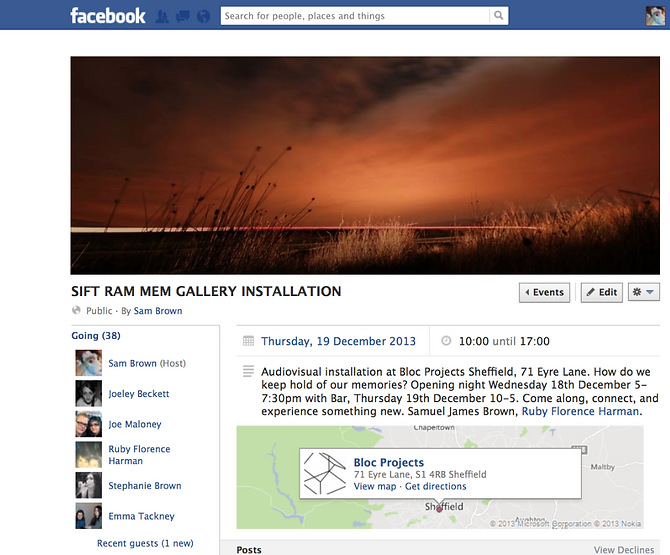 Online social media seemed a great way of getting the installation known about, it's so accessible and used all the time by lots of people. I started by creating links on the website to my linkedin profile for professional contacts, twitter to see what people are tweeting about the project as well as allowing people to show interest, moreover linking to the facebook event page. I decided to have a go at facebook advertising out of curiosity mainly, you often see very commercial advertisement on facebook so to this crop up on the side or as a sponsored story would hopefully be intriguing to someone. I new to draw clicks I had to use a visually strong image to create intrigue, the text SIFT RAM MEM didn't really work in the square format and wasn't striking enough so I used a striking still from the film itself (below).